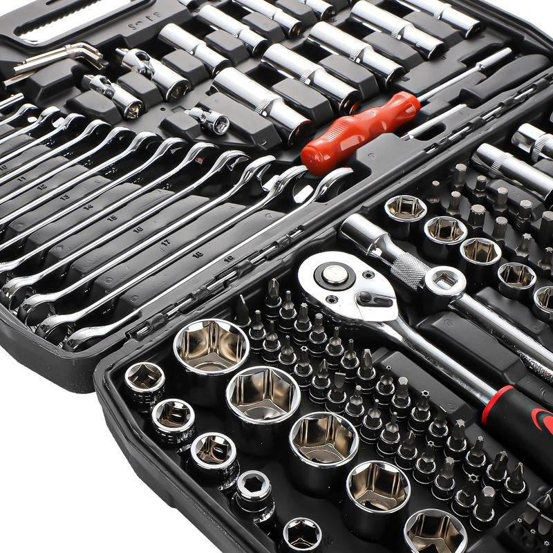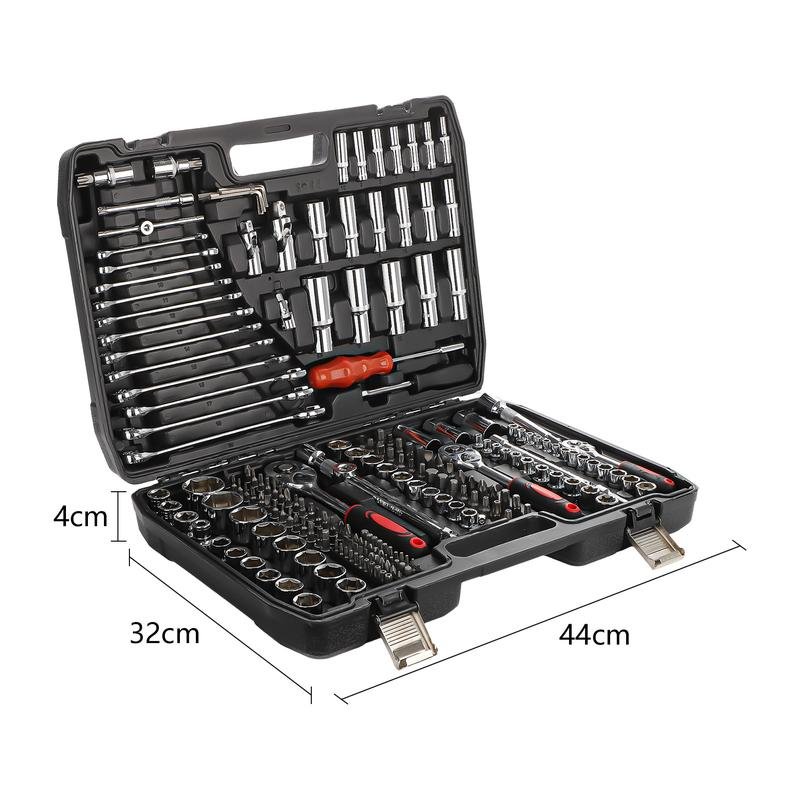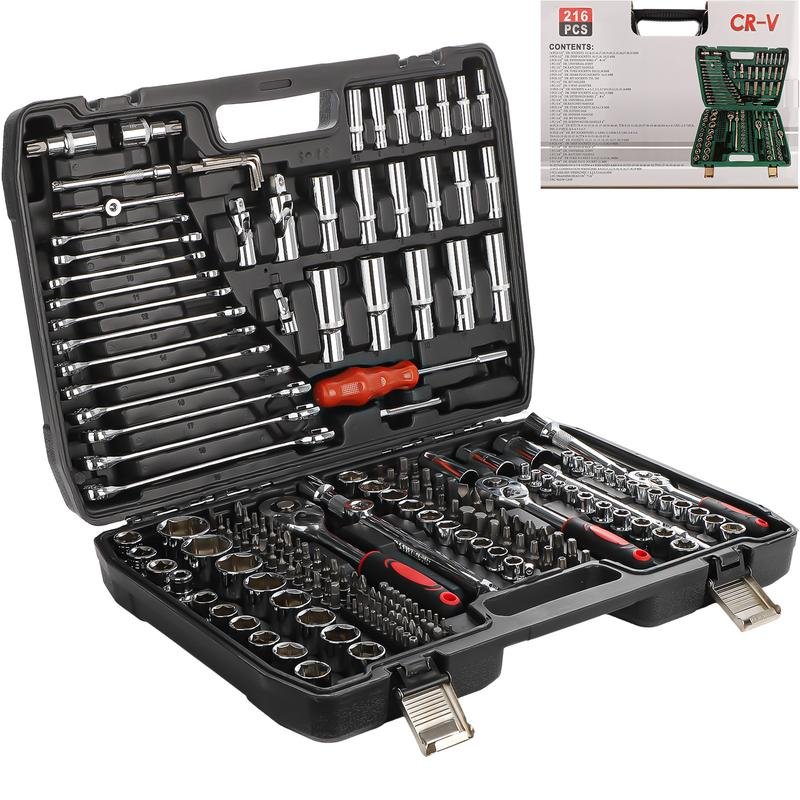 Introducing the Mechanic Tool Set – a comprehensive 215-piece auto repair toolkit designed for all your repair needs.·Complete Set: 215 pieces of essential tools including ratchet wrenches, sockets, spanners, bits, and hex keys.·Versatile Use: Perfect for both professional mechanics and DIY enthusiasts.·Diverse Applications: Ideal for a wide range of auto repairs and maintenance tasks.·[Versatile 215-Piece Set] Our mechanic tool set comes with 215 pieces, including a socket set, ratchet wrench, screwdriver, wrench set, screwdriver set, hex wrench, and more. This comprehensive collection of tools can meet all your needs, making it suitable for a variety of repair tasks.·[Convenient and Organized Storage] All the tools in the socket set are stored in a transport case, ensuring easy organization and quick access. Each tool has a designated place, making it effortless to find the right tool when needed. The ratchet set also includes locking clips, keeping the tools secure inside and preventing damage, making it ideal for workshop environments.·[Multi-Functional Use] This tool kit is perfect for both home and use in emergencies. It contains all the necessary equipment for auto repair and home maintenance, such as and bike repairs, construction work, and more.This mechanic tool set is your go-to solution for efficient repairs, ensuring you have the right tool at hand every time.